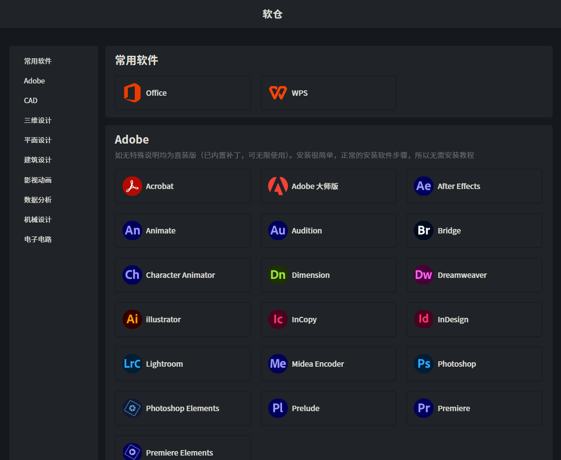 - 提供多种常用软件的下载,包括设计、数据分析、影视动画等等